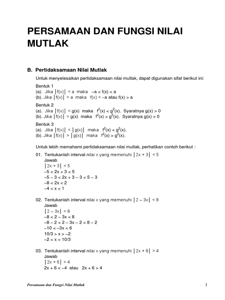 Trik jitu pertidaksamaan nilai mutlak matematika wajib kelas 10. Rangkuman materi bab pertidaksamaan disertai contoh soal dan jawaban dengan pembahasan lengkapnya simak disini. Nilai mutlak menghitung jarak pada suatu langkah 4 cari nilai x seperti yang biasa di lakukan. Persamaan dan pertidaksamaan yang memuat nilai mutlak dalam matematika, sesuatu yang nilainya selalu positif disebut nilai mutlak 1. Pertidaksamaan nilai mutlak merupakan jenis pertidaksamaan yang mengandung nilai mutlak didalamnya.