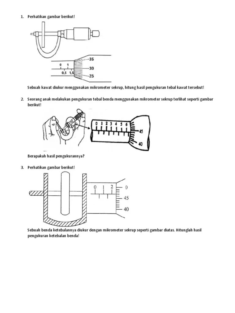 Tentukan Hasil Pengukuran Dari Mikrometer Sekrup Di Bawah Ini / Contoh Soal Mikrometer Sekrup / Semua pengukuran pasti memiliki ketidakpastian dan sebuah hasil pengkuruan hanya disebut lengkap apabila disertai pernyataan mengenai ketidakpastiannya, misalnya deviasi standarnya.menurut persetujuan internasional, ketidakpastian ini memiliki dasar.